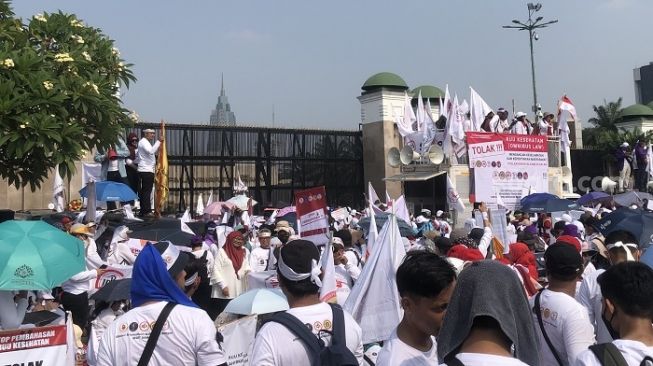 JABARNEWS.ID: Sekitar seribu tenaga kesehatan (nakes) dan non nakes menggelar aksi unjuk rasa di depan Gedung DPR Senayan, Jalan Jendral Gatot Subroto, Jakarta Pusat, Seni, 7 Agustus 2023.
